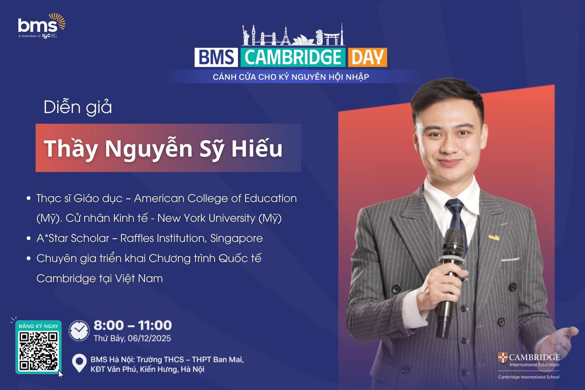👉 Tại BMS Cambridge Day 2025, trong khuôn khổ Hội thảo “Chương trình quốc tế – Cánh cửa cho kỷ nguyên hội nhập”, thầy Sỹ Hiếu sẽ mang đến góc nhìn thực tế, hiện đại và giàu cảm hứng từ chính hành trình của mình – hành trình của một người học Cambridge bước ra thế giới, rồi trở về để lan tỏa những giá trị giáo dục bền vững cho thế hệ học sinh Việt Nam.